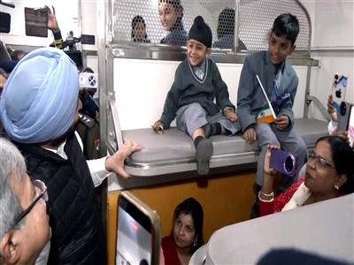 Union Minister Ravneet Singh Bittu interacts with school students at the Amrit Bharat Express Train