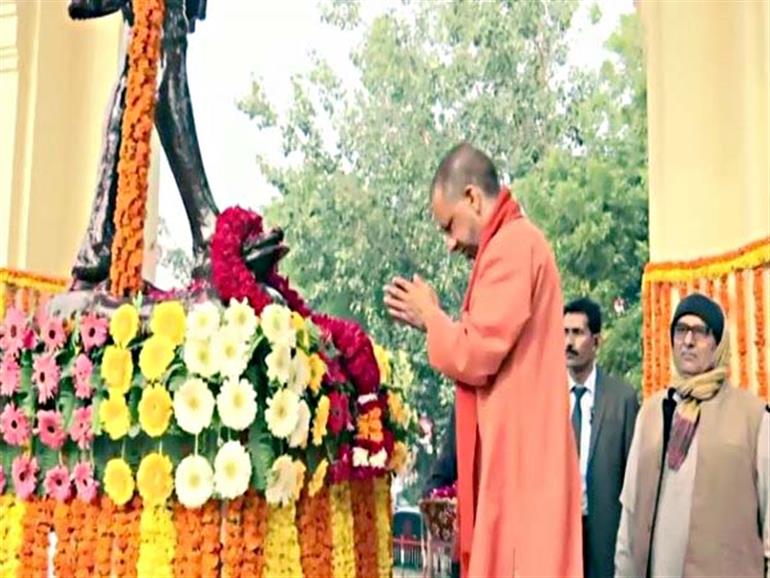 Lucknow : Uttar Pradesh Chief Minister Yogi Adityanath on Monday paid tribute to Mahatma Gandhi as the nation remembered him on his death anniversary. The Chief Minister offered floral tributes at the statue of Bapu at GPO in presence of school children who also paid their respects to the Mahatma through recitation of bhajans. Deputy Chief Minister Brajesh Pathak was also present at the event.