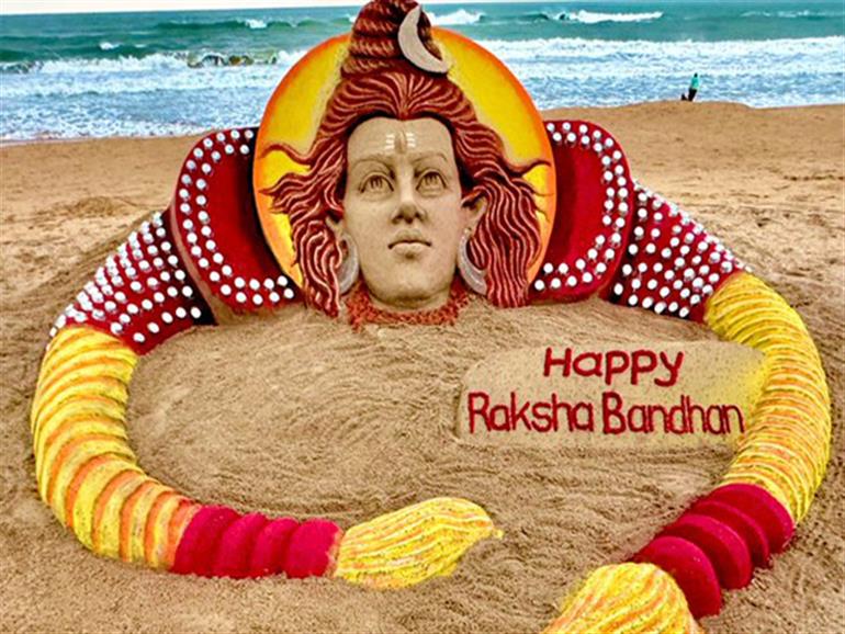 Puri (Odisha) : On the occasion of Raksha Bandhan, sand artist Sudarshan Pattnaik on Monday marked the occasion by making beautiful sand art on the beach of Odisha's Puri. He crafted a sand idol of Lord Shiva as today also marks the last Monday of the auspicious Sawan month.